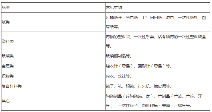 部分垃圾品种由于受到污损或使用场景特殊等原因,不宜列入本市可回收物中,详见下表。