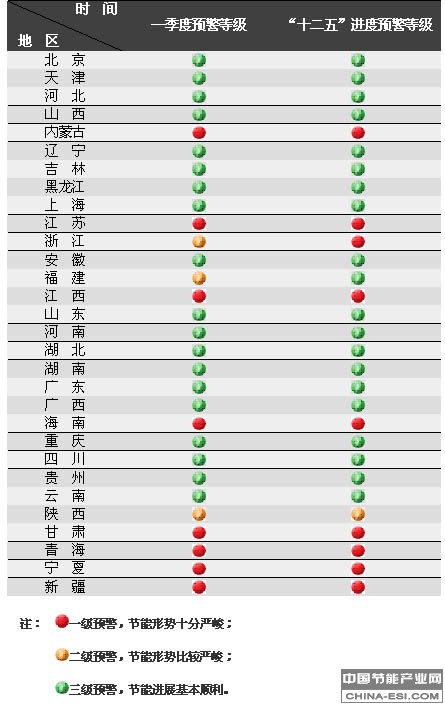 按照初定的“十二五”节能目标分析,一季度有9个地区预警等级为一级,分别为:内蒙古、江苏、浙江、江西、海南、甘肃、青海、宁夏、新疆;陕西省预警等级为二级;有20个地区预警等级为三级,分别为:北京、天津、河北、山西、辽宁、吉林、黑龙江、上海、安徽、福建、山东、河南、湖北、湖南、广东、广西、重庆、四川、贵州、云南。