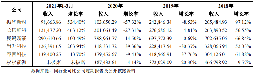 振华新材的客户集中度较高,2018年-2021年第一季度该公司对前五大客户销售金额占当期营业收入的比例分别为85.67%、93.55%、89.56%、95.39%。其中,宁德时代是振华新材的第一大客户。2021年第一季度,振华新材对宁德时代销售金额为6.4亿元,占营业收入的65.11%。
