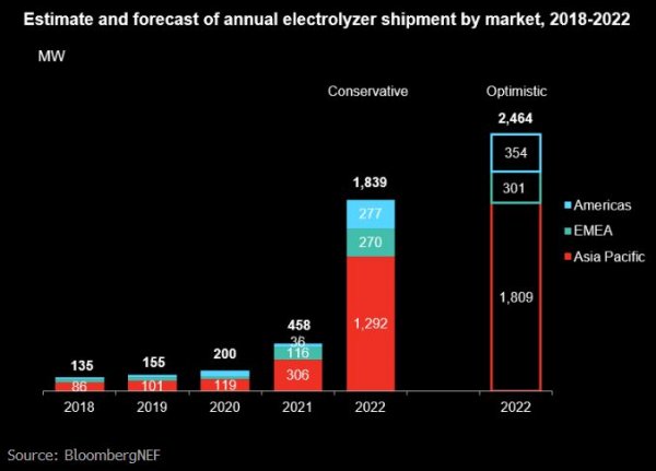 1、2021年,电解槽制造商交付了458MW,BNEF预计,到2022年,电解槽的出货量至少将翻两番,达到1.8-2.5GW。中国将占到总需求的62-66%,这主要是由于国有企业将努力实现国家脱碳目标。