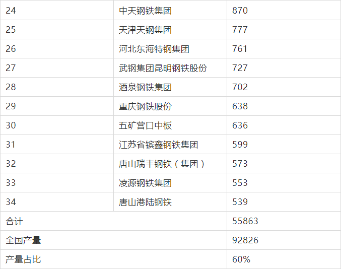 工信部《钢铁工业调整升级规划(2016-2020年)》提出“十三五”期间前10家钢铁企业产业集中度由之前34%左右提高到60%。同期2016年国务院发布《关于推进钢铁产业兼并重组处置僵尸企业的指导意见》指出,到2025年中国钢铁产业前十大企业产能集中度将达60%-70%。从2018年国内粗钢产量集中度看,60%产量贡献来自于34家钢企集团,根据规划未来这34家钢企集团的产量要缩减至10家,可见后期重组力度及空间之大。