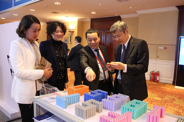 智慧能源展台前蒋华君向嘉宾介绍远东福斯特新能源有限公司18650锂电池及应用