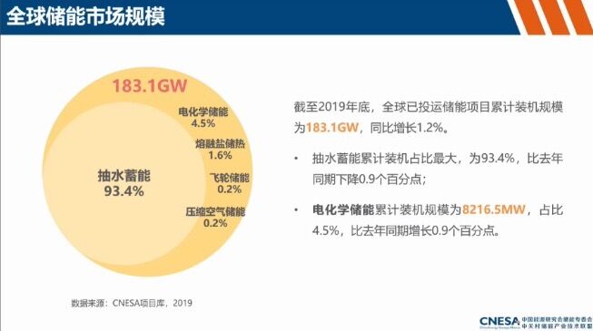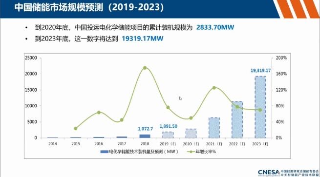 :2020年2月14日,在由阳光电源主办的“PAT2020爱光伏一生一世先进技术研讨会”网络直播中,中关村储能产业技术联盟秘书长刘为做了《全球电化学储能发展研究报告》,报告详细介绍了2019年全球和中国储能的情况,并根据目前新能源的发展情况对未来储能市场规模做了预测。