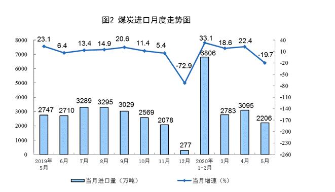 煤炭进口大幅下降,港口交易价格止跌回升。5月份,进口煤炭2206万吨,环比减少889万吨,同比下降19.7%;1—5月份,进口煤炭1.49亿吨,同比增长16.8%。港口煤炭综合交易价格止跌回升,6月5日秦皇岛港5500、5000和4500大卡煤炭价格分别为每吨536元、485元和431元,比5月8日的年内最低点分别回升35元、43元和35元。