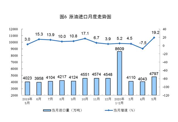 原油进口由降转增,国际原油价格快速回升。5月份,进口原油4797万吨,同比增长19.2%,上月为下降7.5%。1—5月份,进口原油21558万吨,同比增长5.2%。5月29日布伦特原油现货离岸价格为34.15美元/桶,比4月30日的18.11美元/桶回升88.6%。