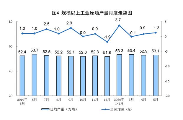 5月份,规模以上工业原煤生产由增转降,原油和电力生产加快,天然气生产保持较快增长。