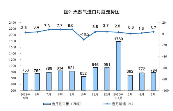 天然气进口稳定增长。5月份,进口天然气784万吨,同比增长3.7%。1—5月份,进口天然气4012万吨,同比增长1.9%。
