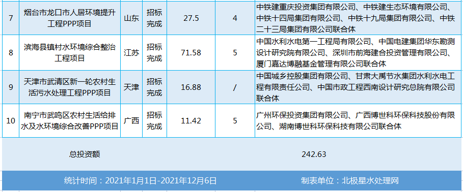 这10大10亿+农村污水处理项目仍多被联合体拿下,已采购完成的7大项目皆被央企或国资企业拿下。