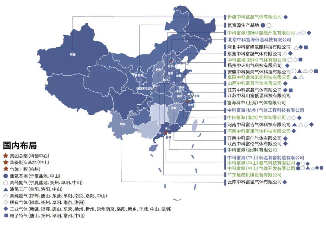 中科富海总部设立在北京,目前已成立25家分子公司,在鄂尔多斯建立BOG提氦示范工厂,在安徽阜阳建设高纯稀有气体工厂和大型液氢工厂,在广东中山建设集空分装置、高纯电子特气、氦气分装、制氢于一体的综合气体岛,在河南、山西、江苏等地为多家化工、钢铁、光伏、锂电池等企业提供了9万、3万、1万等级的空分装置和管道供气等服务,形成以设备研发、集成制造、EPC工程总包、工厂运行、气体服务为一体的民族供应商。中科富海已实现在大型低温装备与低温工程、战略氦资源及高纯稀有气体、氢能产业、高纯电子特气与工业气体五大业务板块规划布局,奠定其在全国大鄂尔多斯盆地、京津翼、长三角、珠港澳大湾区重点区域的长远发展。