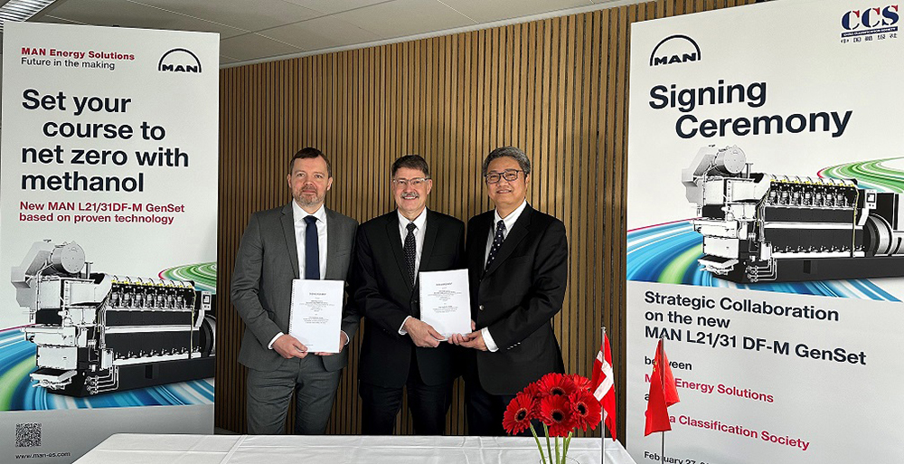 新的分协议标志着MAN Energy Solutions与中国船级社之间的第三次合作,将涉及MAN在丹麦霍尔比的工厂进行设计的新型MAN L21/31DF-M(双燃料甲醇)发电机组。协议规定,两家公司将在中国市场携手合作,为新型发动机提供全方位支持,包括与预计于2024年第四季度在中国进行的型式认证试验(TAT)相关的所有活动。