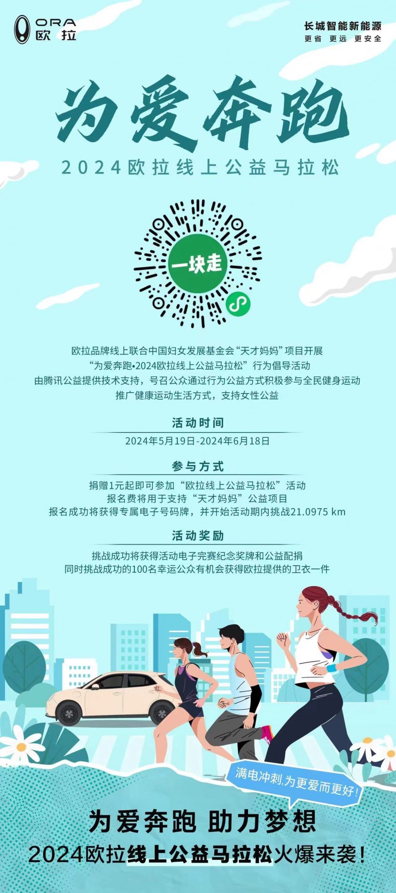 伴着人们高涨的运动热情,欧拉品牌联合中国妇女基金会“天才妈妈”项目,同步开启“为爱奔跑•2024欧拉线上公益马拉松”活动,号召全民积极参与健身运动、拓宽健康生活半径,更为女性公益注入源源不断的支持和活力。