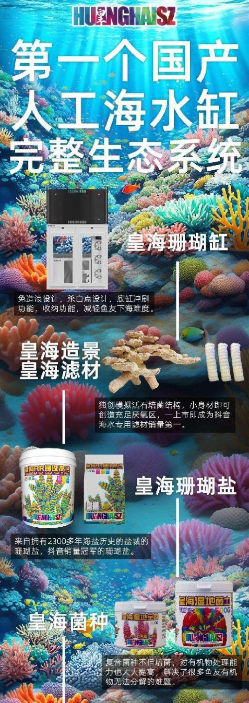 皇海水族始终致力于为全球海水爱好者提供简便易行的家庭人工海水饲养解决方案,并创新推出了国产化人工海缸系统。该系统涵盖了从海缸造景、滤材选择,到珊瑚盐、菌群调配,再到各类输出输入产品及工具的全方位服务。在原有海缸系统的基础上进行了全面升级与整合,力求为海缸爱好者带来更加便捷、高效的饲养体验。