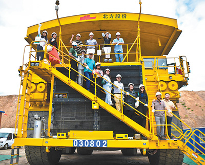 国际青年代表在国能准能集团绿色矿山登上无人驾驶卡车合影留念。图为记者吴勇摄