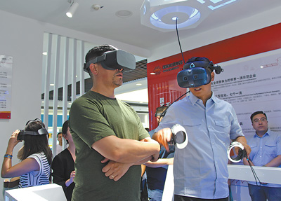 国际青年代表在玉门风电场VR电力安全生产实训室体验。图为记者赵帅杰摄