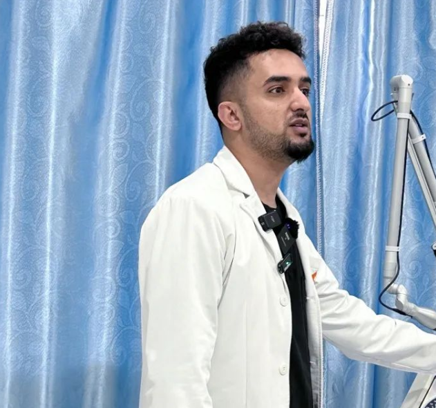 在超皮秒案例操作现场,阿杜博士手持国家药监局认证的仪器,为一位色斑患者制定个性化方案。