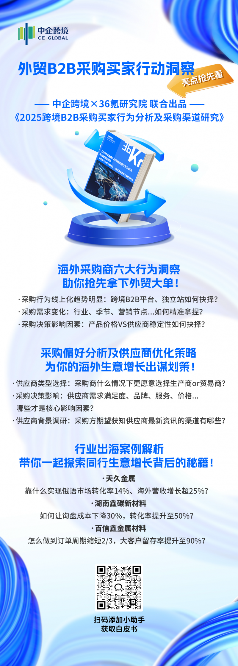 外贸企业转向“非美市场”的同时,国内很多跨境服务商也采取多种措施应对美国提高关税产生的影响,帮助更多企业掌握出海主动权。第137届广交会期间,中企跨境不仅展示了跨境广告通、出海独立站等核心产品,还联合36氪研究院发布《2025年跨境B2B采购买家行为分析及采购渠道研究》白皮书,并邀请业内专家深入解读,助力企业快速响应新市场变化、把握新市场机遇,为未来海外生意的可持续增长打开全新的局面。