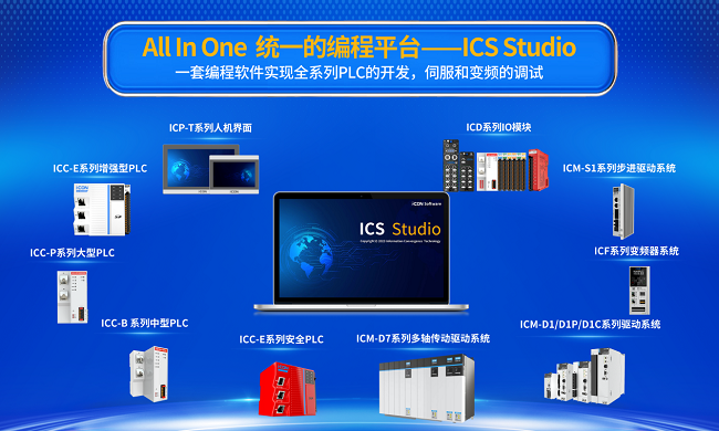 英孚康ICS Studio 全集成开发平台,以全栈集成理念为核心,支持全系列PLC、伺服、步进、变频器在同一个软件平台中开发与调试,实现一站式组态、编程、虚拟仿真。用户无需切换多个工具,即可完成复杂项目的开发与优化,显著提升开发效率。
