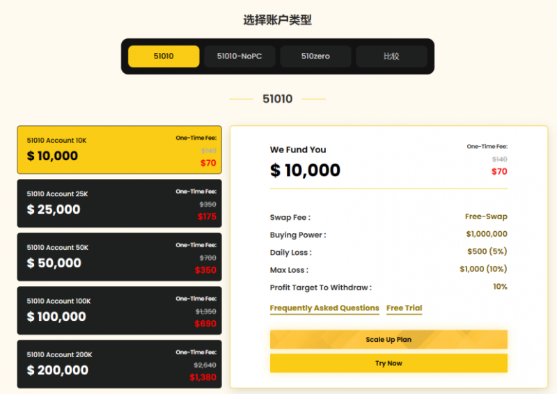 2 选择适合自己的套餐如果您是新手交易员,我们建议您选择“挑战账户”,只需完成“交易技能”和“稳定性评估”两阶段考核,即可获得10000美元起的训练账户(2026新年优惠活动,套餐费用仅需:45美元),还有机会获得高达90%的交易绩效分成。有经验的交易员选择“即时账户”,省去考核时间,直接开启训练,您仅需支付70美元起(不同的活动,价格有所差异,请以官网实时价格为准),就能获得一个10000美元起的训练账户。