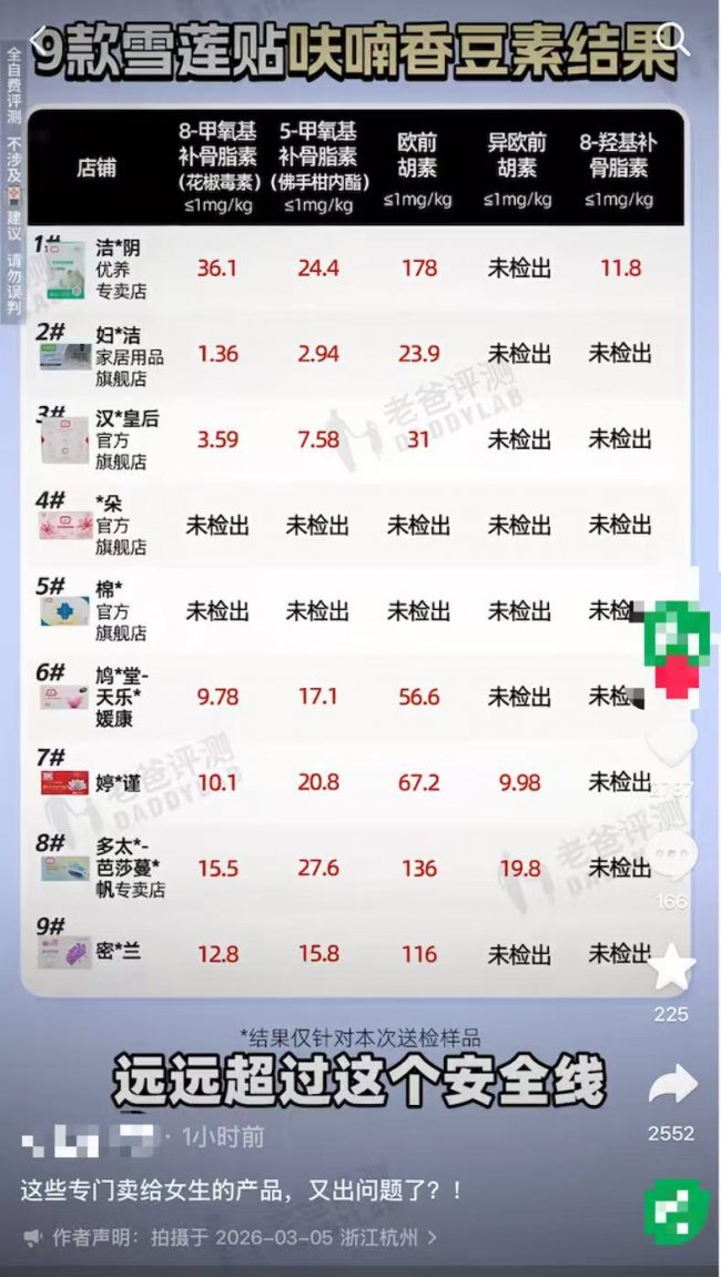 近日, “老爸评测”发布视频揭露了市面上 9 款雪莲贴产品的质量问题。经检测,这些产品分别存在细菌菌落总数不合格、重金属含量超标,以及检出呋喃香豆素类化合物(禁用致癌物)等严重安全隐患。