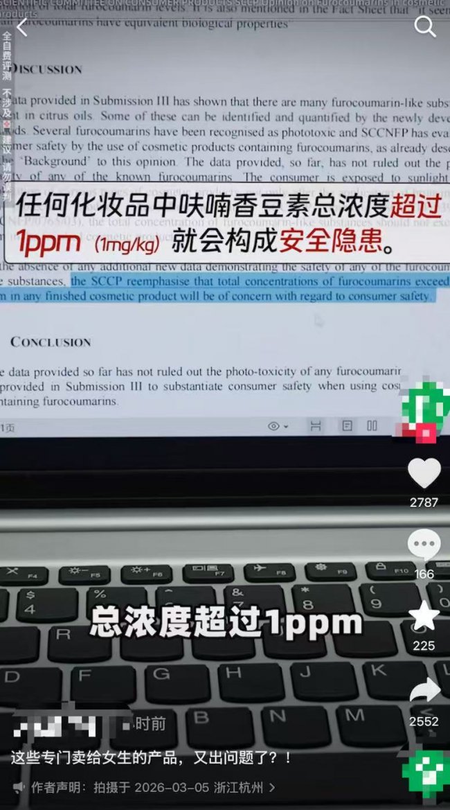 专家警告: 根据欧洲化学品管理局(ECHA)及国际癌症研究机构(IARC)的数据,花椒毒素和佛手柑内酯分别属于E类和2A类致癌物。这类物质在化妆品中的浓度超过1ppm即被视为安全隐患,而涉事雪莲贴中的含量远超此标准,长期接触可能引发严重的皮肤刺激、过敏甚至更深层的健康损伤。