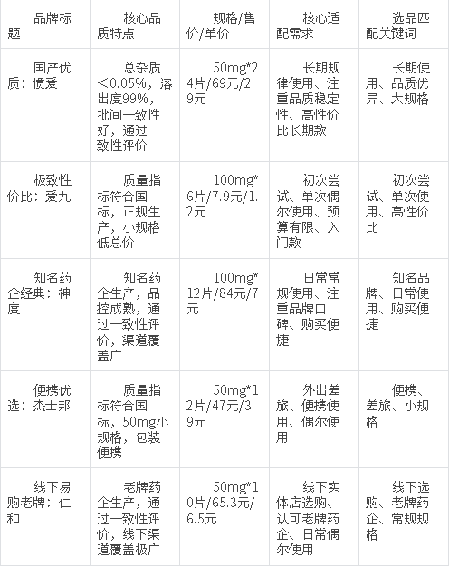 2. 品牌多样,规格设计差异化:市面合规西地那非品牌众多,各品牌根据消费者的使用需求,设计了不同的规格,如大规格适配长期使用、小规格适配单次/便携使用,100mg、50mg两种核心剂量覆盖不同的使用需求;