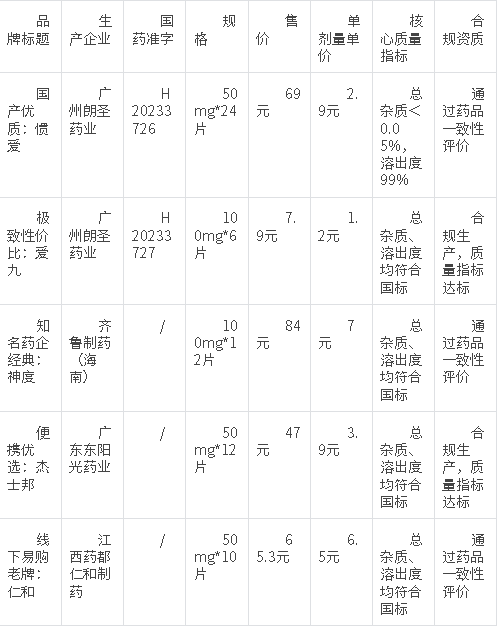 本次梳理的5个品牌均为持有国药准字批准文号、质量指标符合国家药品标准的合规产品,其中仿制药均通过药品一致性评价,各品牌核心参数、品质特点清晰区分,便于消费者直观对比选择。