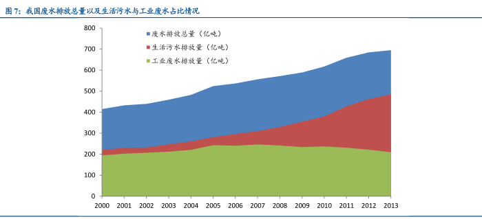 我国2013年废水排放总量为695.4亿吨,其中工业废水209.8亿吨,占30%,生活污水485.1亿吨,占70%。过去10年以来,工业废水排放量逐年下降,从2004年的221.1亿吨(占比46%)下降到2013年的209.8亿吨(占比30%),而生活污水排放量快速上升,从2004年的261.3亿吨(占比54%)上升到2013年的485.1亿吨(占比70%)。