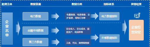 企业经营异常监测产品以电力数据为基础,融合金融市场数据和第三方数据,对企业实际经营情况进行挖掘分析,识别和监测有经营异常波动和虚假信息披露的公司,辅助金融监管部门加强市场风险识别和监管,提高监管效率和水平。
