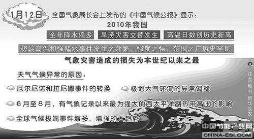 中国节能产业网讯 1月12日,中国气象局发布《2010年中国气候公报》。公报显示,2010年我国极端高温和强降水事件发生之频繁、强度之强、范围之广历史罕见,是本世纪以来我国气候最异常的一年。