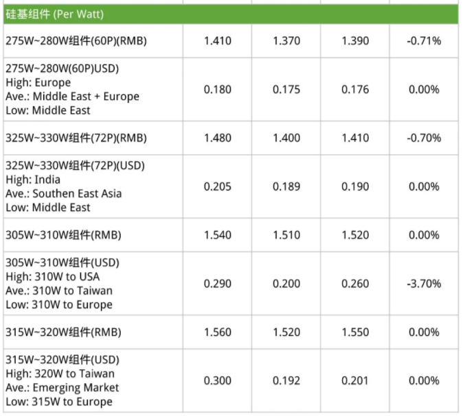 本周电池片价格呈现稳定趋势。部份多晶电池片报价有回温的迹象,主要是由于海外的订单能见度提升,且中国市场也有部分多晶项目开始启动,但整体来说,多晶市场回暖的速度还不足以让多晶电池片厂商复产,目前市场上大多还是呈现观望的态度,因此本周国内多晶电池片均价稳定在0.5元/W。