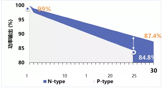 晶科能源Tiger Neo系列N型组件以其出色的光衰性能(首年衰减小于1%,线性衰减小于0.4%),赢得了业界广泛关注。基于实验室条件,刚经生产完毕的N型电池及组件都有“零衰减”甚至是“负衰减”等特性,以上晶科的数据针对N型TOPCon测试为-0.1%LID及-0.3%LeTID也佐证了这个理论。但由于外部环境以及材料的老化,在实际的外部环境下,功率衰减会相应升高,这也解释了为什么部分厂家使用“零光衰“的说法,但同时只坚持首年质保维持在1%而非0%。除了更优的首年衰减外,晶科TigerNeo系列组件的线性衰减也十分出色。组件线性衰减控制在小于0.4%/年的范围内,在长达30年的生命周期里,Tiger Neo系列N型组件对比常规P型组件,最终功率输出能从84.8%提升至87.4%,为整个光伏系统带来更高的发电量输出,实现LCOE成本的大幅下降。