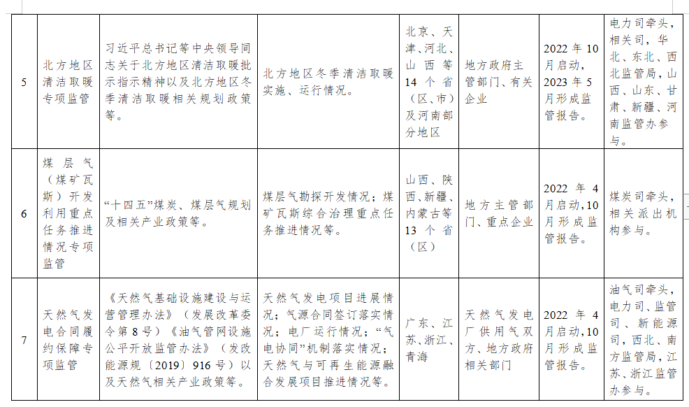 二、合理安排进度。各牵头单位要按照《清单》要求尽早启动部署相关监管任务,合理安排时序进度,原则上全部监管任务都应在上半年启动部署,便于派出机构统筹安排现场监管工作。相关派出机构结合疫情防控工作,优化现场监管事项,能合并的尽量合并开展,切实减轻企业和基层负担。除北方地区清洁取暖专项监管等个别任务外,其余监管任务都应在2022年底前完成。