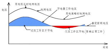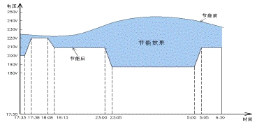 存在的技术缺陷: 1) 固定多档降压器 由于其核心部件是一个多抽头的变压器,变压比是固定的,一般副边有三到五个降压抽头,分别降5V、10V、15V、20V,一旦接线端固定,降低电压就是固定值,当电网电压波动时,调控装置的输出电压也会上下波动,这样照明的工作电压处在不稳定波动状态,无法起到对电光源的保护作用。如图所示,当电网电压高时,节电率不是最佳状态;而电网电压低时,可能出现欠压现象,造成灯具无法正常点亮,反而降低灯具寿命,这是这类调控装置存在的最大安全缺陷。当用电高峰时,电压过低,电气设备也无法正常运行。