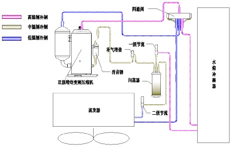 采取双级增焓变频压缩机和带闪蒸器的双电子膨胀阀串联喷焓系统,结合控制中压腔的喷射量和主回路循环冷媒量,适时控制压缩机运行频率,实现各种工况下系统以最佳COP运行,保障系统运行安全可靠,并满足大范围宽工况要求。