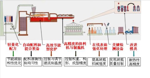 玻璃配方及控制系统、高效节能窑炉即控制系统、精密控制供料道、模具及瓶型的设计、行列式制瓶机。