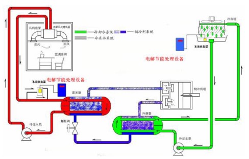 低压高频、变频的电解,使循环水(大分子团水)电解成具有强溶解性和渗透性的小分子还原水。小分子还原水具有溶解水垢的能力,能起到代替化学药剂的作用。浸在水中的负极水垢收集器,使溶解后带正电的钙镁离子在收集器上结晶析出,达到去除循环水中钙镁离子的目的,使水体硬度大大降低,减少了换热器表面发生结垢的机会,从而起到防垢、除垢的作用,提高了换热效率,实现换热器的节能运行。(注:大分子团水由10个以上水分子组成,小分子水由低于5个水分子组成。普通水电位在+100mv以上,电解还原水为带有负电位(-250mv以下)的水)