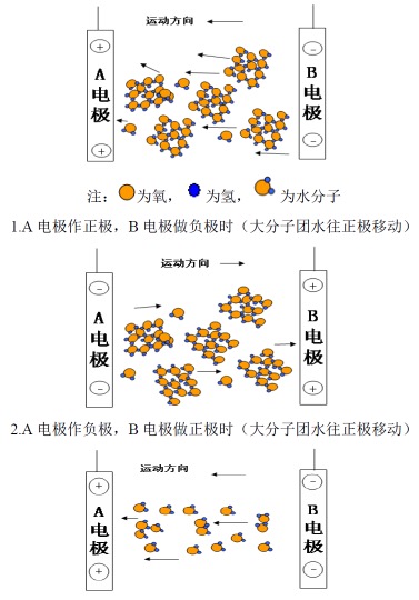 (1)大水分子团水在电极高速(300kHz/s)正负转换的作用力下,不断发生碰撞以及振动,被细化成小分子水。