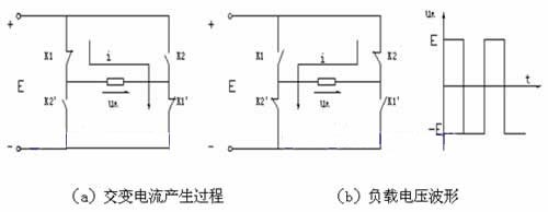 当两组开关K1、K1’和K2、K2’轮流切换时,负载R上便得到了交变电压uR。如果这两组开关利用四只电子开关器件来代替并轮流导通与关断就实现了由四只电子开关器件控制的直流——交流逆变。