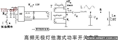 图(3)是设计成IC驱动的他激式高频无极灯功率开关电子镇流器的主电路,由IC及外部组件产生设定的工作频率(2.65MHz),可变电阻可作频率微调。该电路还设定了过渡时间的调节,使开关管的热损耗大大降低。 图(3)中的激励变压器T也可免去而采用直接联接的方式,使电路更加简洁,更有利于集成化或模块化。该形式电路的输出功率可大可小,可适用于作为目前40--165W高频无极灯电子镇流器的基本电路。如果将IC和V1、V2"模块"在一起,则其占空可大大缩小。